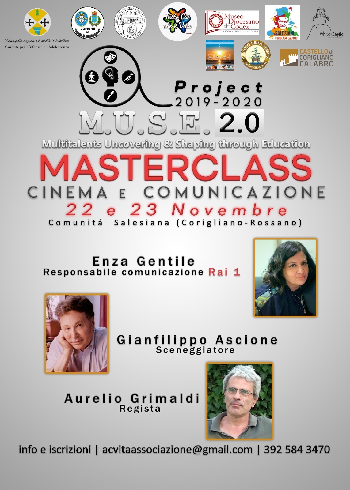 Ospiti d’eccezione in questo primo appuntamento: “Aurelio Grimaldi, regista e autore di moltissimi film di successo come Mary per Sempre, Ragazzi fuori, ecc; Gianfilippo Ascione, sceneggiatore internazionale e già stretto collaboratore di Federico Fellini; Enza Gentile, responsabile area comunicazione di Rai 1. Il progetto si pone come obiettivo la ricerca e promozione del talento nei giovani del territorio, nell’ottica di prevenire e contrastare la devianza e il disagio giovanile. Altresì, persegue la finalità di favorire l’inclusione sociale e valorizzare le bellezze artistiche e culturali della neonata città unica di Corigliano-Rossano”.
