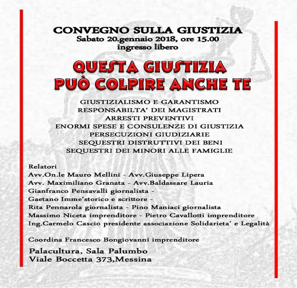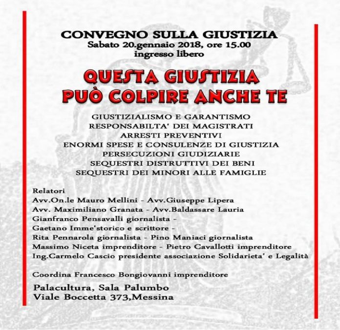 Sabato 20 gennaio alle ore 15, al Palacultura di Messina in viale Boccetta presso la Sala Palumbo, si terrà un convegno dal tema “Giustizia – Questa Giustizia puo’ colpire anche te”. Nel corso di questa importante iniziativa, saranno trattati argomenti, come ad esempio giustizialismo e garantismo, responsabilità dei magistrati, arresti preventivi, enormi spese e consulenze di giustizia, persecuzioni giudiziarie, sequestri distruttivi dei beni e sequestri dei minori alle famiglie.
