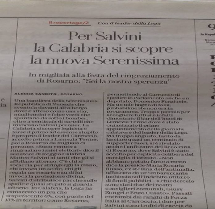 L’assessore all’Ambiente della Giunta Accorinti, Daniele Ialacqua, nel costatare un grande consenso di un Partito nordista, in un post su Facebook scrive: “su -La Repubblica- la cronaca della visita di Salvini in Calabria a Rosarno accolto come un liberatore”.