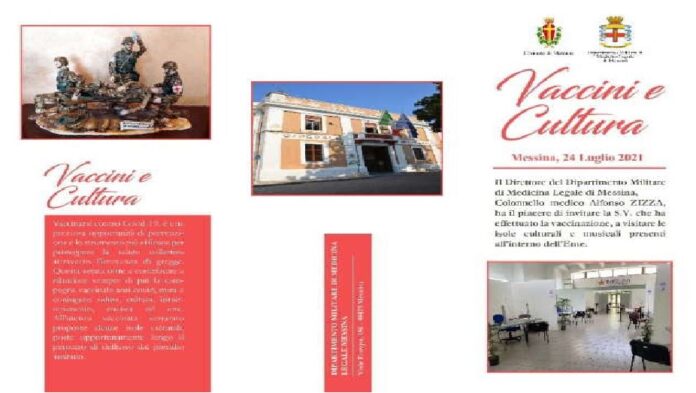 Dopo essersi sottoposti al vaccino si potrà infatti assistere all’esibizione di vari gruppi che si esibiranno sul palco del Dipartimento, tra i quali la Banda Musicale della Brigata Meccanizzata “Aosta” ed un quintet del Conservatorio Corelli. Inoltre sarà possibile visitare l’esposizione storica della Sanità Militare del Regio Esercito, dalla fine del XIX secolo alla II Guerra Mondiale, di proprietà del Generale Messale, e la mostra curata dall’esperto comunale di arte contemporanea Alex Caminiti con gli artisti dell’Organizzazione GAS collettivo d’arte indipendente, Felipe Cardena (Spagna); Svetlana Grevenyuk (Ucraina); Sara Baxter (Inghilterra); Ma Lin (Cina); Gimaka (Senegal); Sadif (Egitto); e gli italiani Michele D’Avena, Fabio Carmelo D’Antoni, Sabrina Di Felice; Roberta Dallara; e Alex Folla.