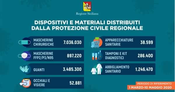Oltre tredici milioni di dispositivi di protezione individuale e apparecchi sanitari sono stati distribuiti – dall’inizio dell’epidemia fino a ieri – dalla Regione Siciliana, tramite la propria Protezione civile. A beneficiarne, principalmente: strutture sanitarie, case di riposo per anziani, residenze sanitarie assistite, Comuni, Prefetture, Forze dell’Ordine, Esercito, ex Province, carceri, dipartimenti regionali, Confcommercio e Confesercenti.