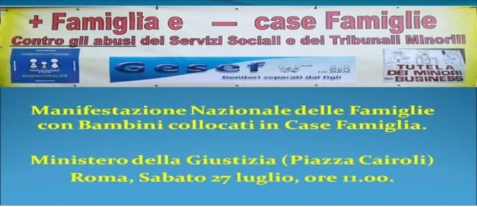 L’Associazione Gesef (Genitori separati dai figli), nella nota seguente, comunica che: “sabato 27 luglio alle ore 11.00 manifestazione nazionale delle famiglie con minori in casa Famiglia a Roma nei pressi del Ministero di Grazia e Giustizia (piazza Cairoli). Anche se è un sabato e probabilmente farà caldo, non perdiamo questa occasione per gridare tutta la nostra rabbia per tutti i bambini Sottratti ai loro genitori. Fate girare!!! Mobilitiamoci , facciamo passa parola in rete. Ora o mai più”!