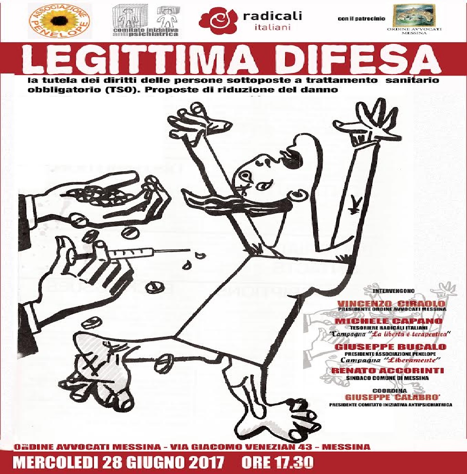 “Il convegno -Legittima difesa. La tutela dei diritti delle persone sottoposte a trattamento sanitario obbligatorio (TSO). Proposte di riduzione del danno- si terrà mercoledì 28 giugno a partire dalle ore 17.30 presso la sala dell’Ordine degli Avvocati di Messina in via Giacomo Venezian n. 43, che ha concesso il patrocinio all’iniziativa”.