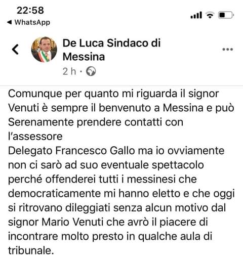 “Il sindaco…, minaccia querela”. Ad evidenziarlo ieri su Facebook, e’ stato il cantante siciliano Mario Venuti riferendosi al primo cittadino di Messina, Cateno De Luca, dopo un suo post nel quale esprimeva le sue doglianze per una trattativa naufragata… su un eventuale concerto.