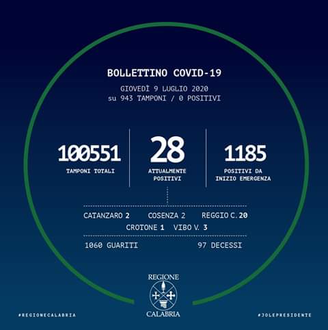 – Catanzaro: 1 in reparto; 1 in isolamento domiciliare; 182 guariti; 33 deceduti.