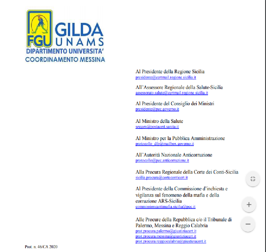 - Alle Procure della Repubblica c/o il Tribunale di Palermo, Messina e Reggio Calabria prot.procura.palermo@giustiziacert.it, prot.procura.messina@giustiziacert.it, prot.procura.reggiocalabria@giustiziacert.it Prot. n. 46/CA 2020.