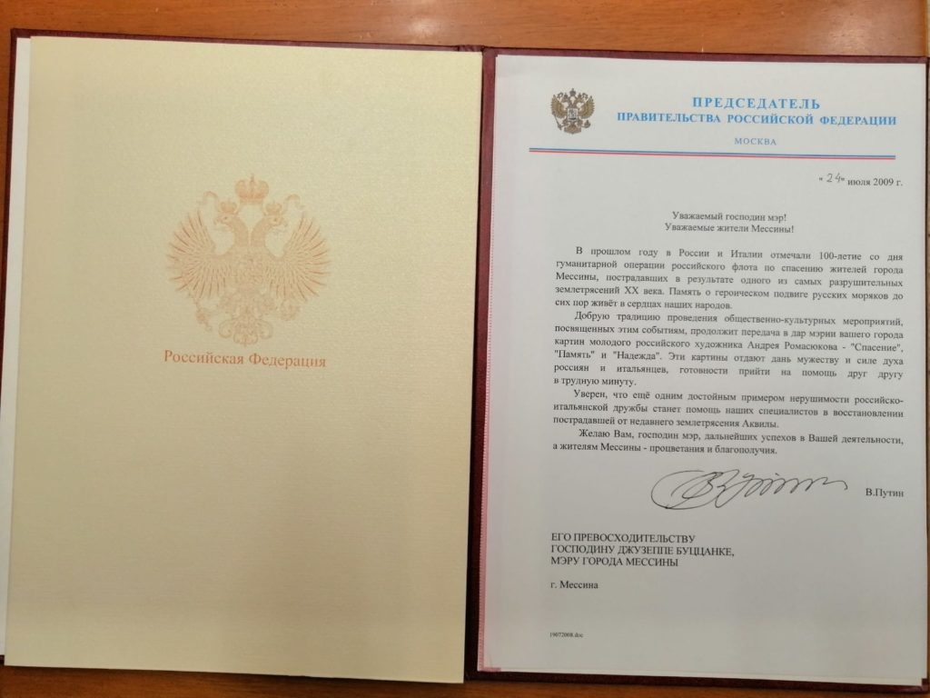 La pergamena originale con la quale il consiglio comunale concedeva la cittadinanza onoraria all’ex arcivescovo Giovanni Marra. Una lettera autografa del presidente della federazione Russa Vladimir Putin in cui si ringrazia il sindaco di Messina Giuseppe Buzzanca per le celebrazioni riservate ai marinai russi per il loro prodigarsi nei soccorsi ai messinesi dopo il terremoto del 1908. Il progetto dell’acquedotto messinese redatto dal progettista originale, Domenico Galatà.