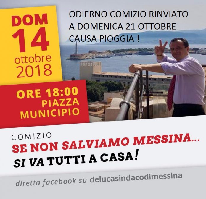 14 ottobre 2018 – Dopo il Comizio del 30 settembre scorso dal titolo: “-Ed ora vi racconto Messina-, quello odierno inizialmente previsto a piazza Unione Europea è stato rinviato per decisione del primo cittadino di Messina, l’onorevole Cateno De Luca. Alla base della sua volontà, il concomitante maltempo che caratterizza la nostra Città in questa domenica”.