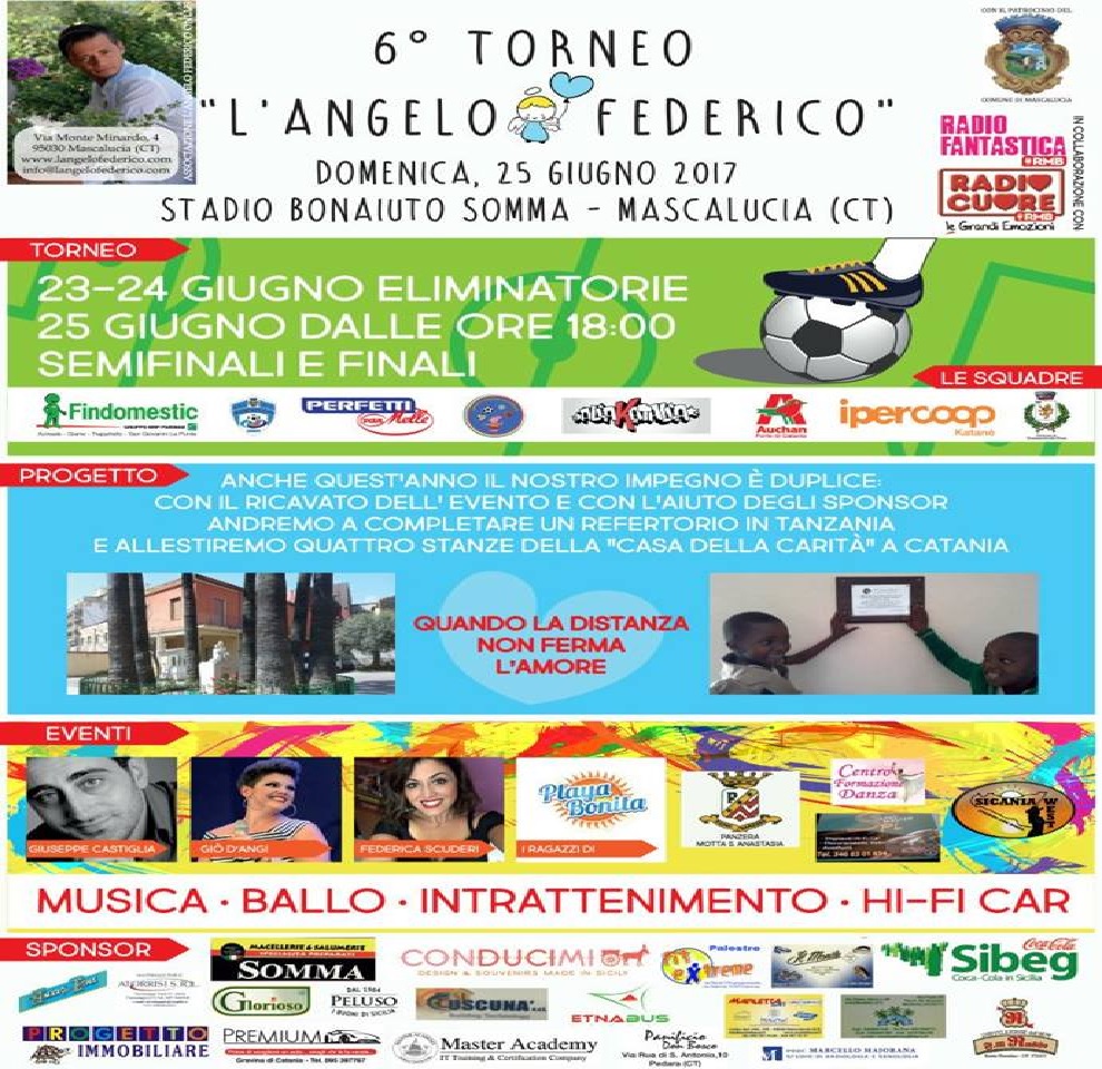 Il prossimo fine settimana, da venerdì 23 fino a domenica 25, si terrà il 6° Torneo “L’Angelo Federico”, presso lo Stadio “Bonaiuto-Somma” di Mascalucia (CT), organizzato dall’omonima Associazione presieduta da Dario Vellini che questo pomeriggio ha spiegato le finalità dell’evento, intervistato da Peppe Costa su: “Radio Cuore RMB” (F.M. 88.5 Mhz) in diretta dal Centro Commerciale Etnapolis.