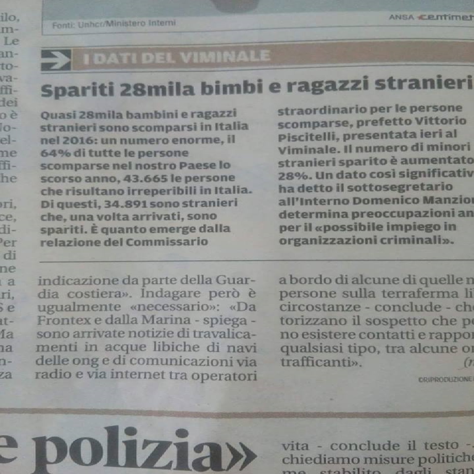 Lo scrittore Massimo Festa, in un suo post su facebook nel sostenere come esista un businnes dei bambini scomparsi afferma: “Com’è noto, i dati ufficiali diffusi dalla mafioneria sono inferiori a quelli reali. I bambini -in nero- finiscono nei giri protetti dell’alta pedofilia, dei riti satanici e del traffico d’organi”.