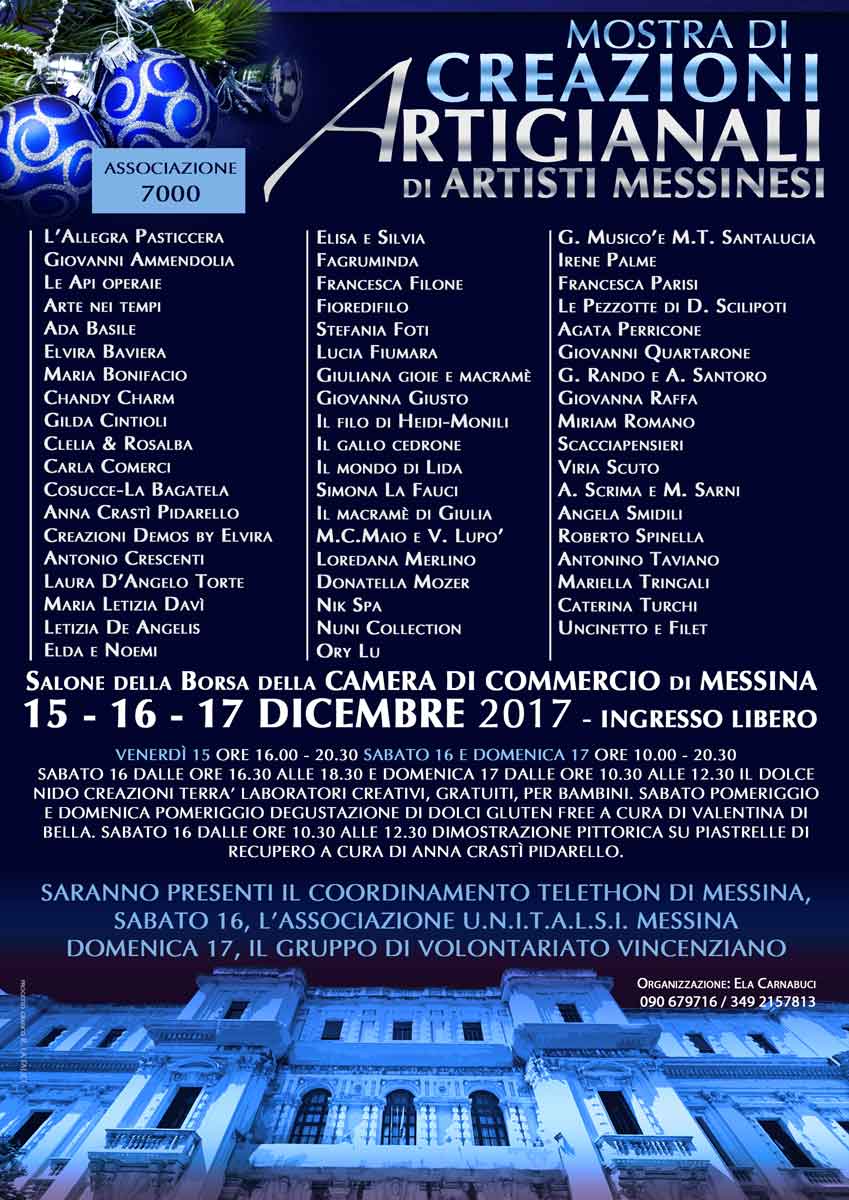 L’Associazione 7000 presenta il 15-16 e 17 dicembre 2017 presso il Salone della Borsa della Camera di Commercio di Messina l’annuale Mostra di Creazione Artigianali di Artisti Messinesi, per l’organizzazione di Ela Carnabuci.