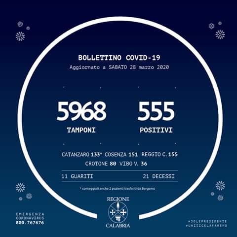 In Calabria ad oggi sono stati effettuati 5968 tamponi. Le persone risultate positive al Coronavirus sono 555 (+61 rispetto a ieri), quelle negative sono 5413.