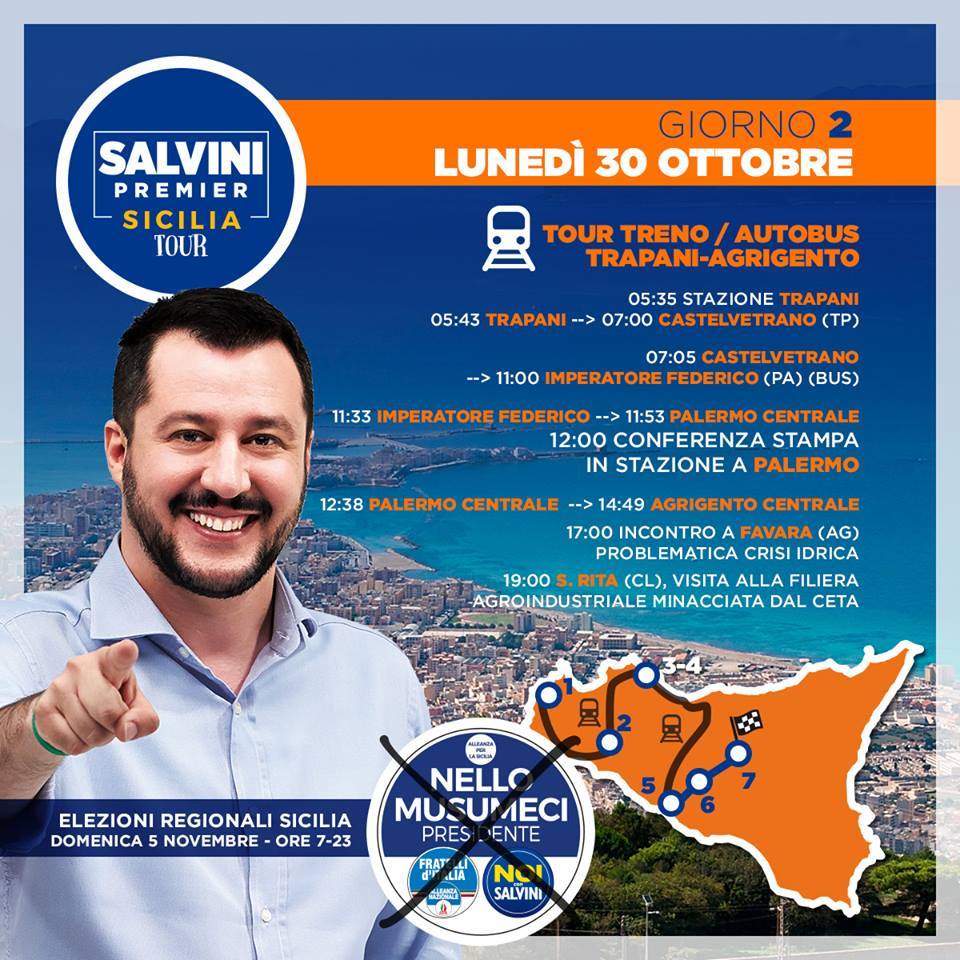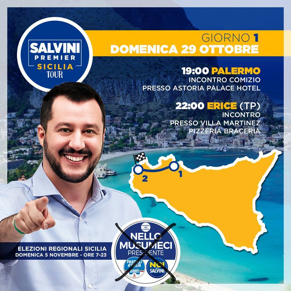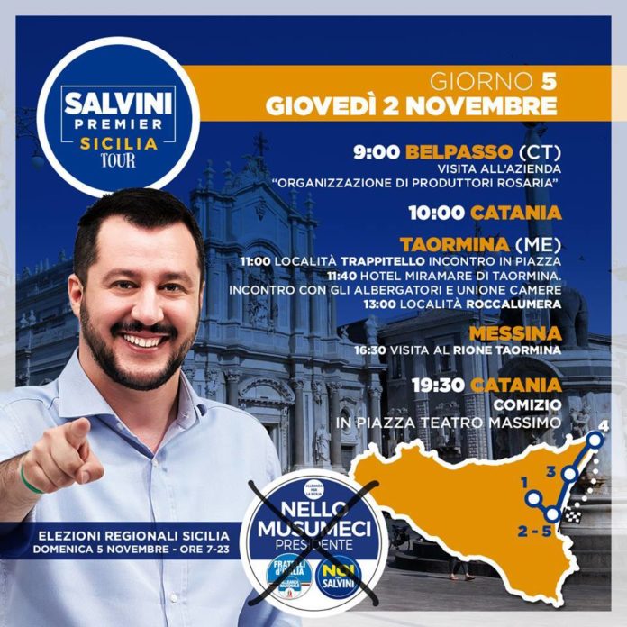 DA DOMENICA 29 OTTOBRE A VENERDÌ’ 3 NOVEMBRE, MATTEO SALVINI SARA’ IN SICILIA PER SOSTENERE LA CAMPAGNA ELETTORALE DEI NOSTRI CANDIDATI PER NELLO MUSUMECI PRESIDENTE, NELLE ELEZIONI DEL PRESIDENTE E DELL’ASSEMBLEA REGIONALE SICILIANA CHE SI TERRANNO DOMENICA 5 NOVEMBRE.