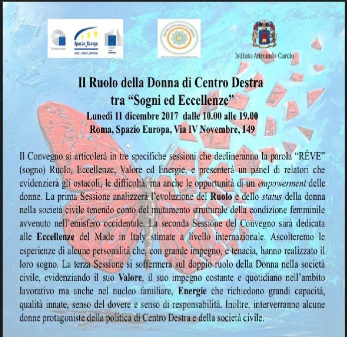 Si è tenuto oggi a Roma, fino alle ore 19, nello -Spazio Europa-, un importante convegno, per descriverne i contenuti si specica che: “sogni ed eccellenze, due termini che in sé portano infinite declinazioni specialmente se coniugati al femminile. Un ventaglio ampio di possibilità e di relazioni, di esperienze e di visioni che sono state estrapolate e sviscerate durante il Convegno -Il ruolo della Donna di Centro Destra fra Sogni ed Eccellenze- svoltosi in una prestigiosa cornice in via IV Novembre”.