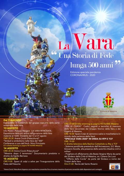 Seguirà, in onda su Rtp e TCF uno ”Speciale Vara” dedicato alle precedenti edizioni. La messa in onda su Rtp e TCF del Solenne Pontificale del 15 agosto consentirà di potere seguire da casa la S. Messa celebrata da S.E. l’Arcivescovo mons. Giovanni Accolla, mentre altri appuntamenti saranno trasmessi in diretta streaming sulla pagina fb “VisitMe-Messina”.