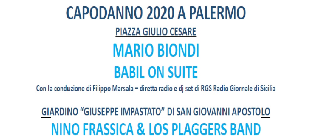 La città di Palermo darà il benvenuto al nuovo anno con una grande festa che vedrà coinvolti due principali luoghi: piazza Giulio Cesare e l’area antistante il Giardino Peppino Impastato di San Giovanni Apostolo, regalando due grandi spettacoli per celebrare il 2020 all’insegna della festa, della condivisione e del buon augurio.