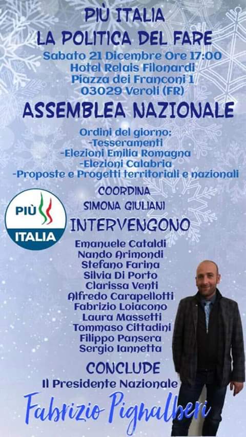 A Veroli (FR): si terra’ sabato 21 dicembre alle ore 17.00, l’Assemblea Nazionale del Movimento Piu’ Italia, il sodalizio politico presieduto da Fabrizio Pignalberi.