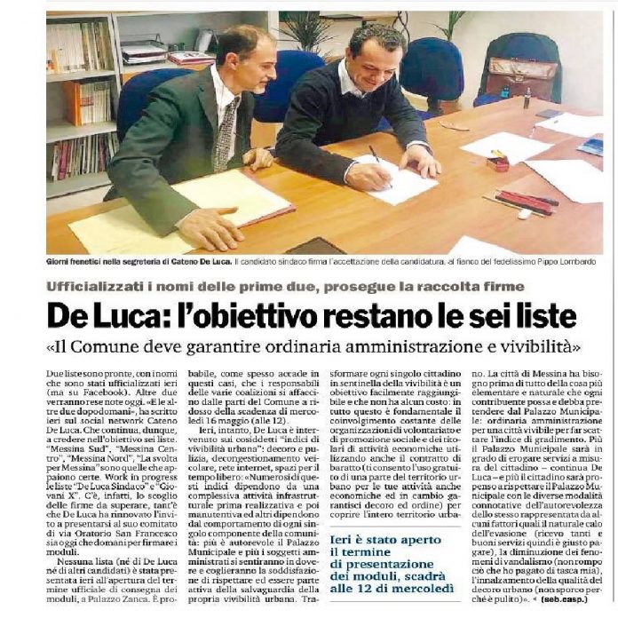 Sulla propria pagina Facebook, Cateno De Luca il parlamentare dell’Assemblea regionale siciliana e candidato alle elezioni del 10 giugno, scrive: “qualcuno mette in dubbio, che non raggiungeremo l’obiettivo delle sei liste? Intanto abbiamo completato tutte le procedure inerenti le accettazioni delle 192 candidature nelle sei liste collegate a De Luca Sindaco di Messina”.