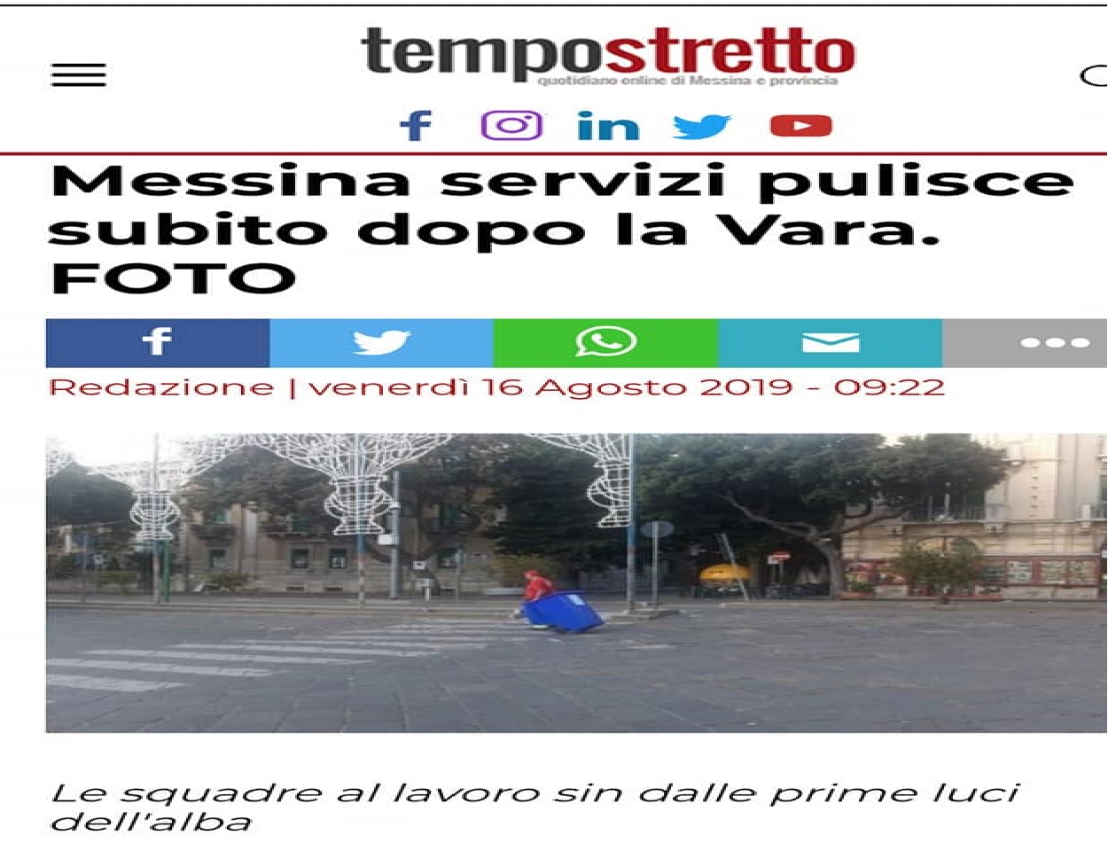 E poi: “cosa posso farci, non riesco ad abituarmi alla disinformazione di -certa stampa- e di certi -leoni da tastiera- ed ai -deliri- di onnipotenza di -certa politica-. Ma come si fa ad esaltare ad esempio come un fatto mai accaduto la pulizia post Vara di Messinasservizi -un’azione congiunta e attenta che ha evitato le brutte immagini del passato con rifiuti lasciati ovunque…-, quando basta fare una semplice ricerca su internet per vedere che da anni i lavoratori di Messinambiente/Messianservizi intervengono immediatamente nella pulizia delle strade dopo il Ferragosto?”.