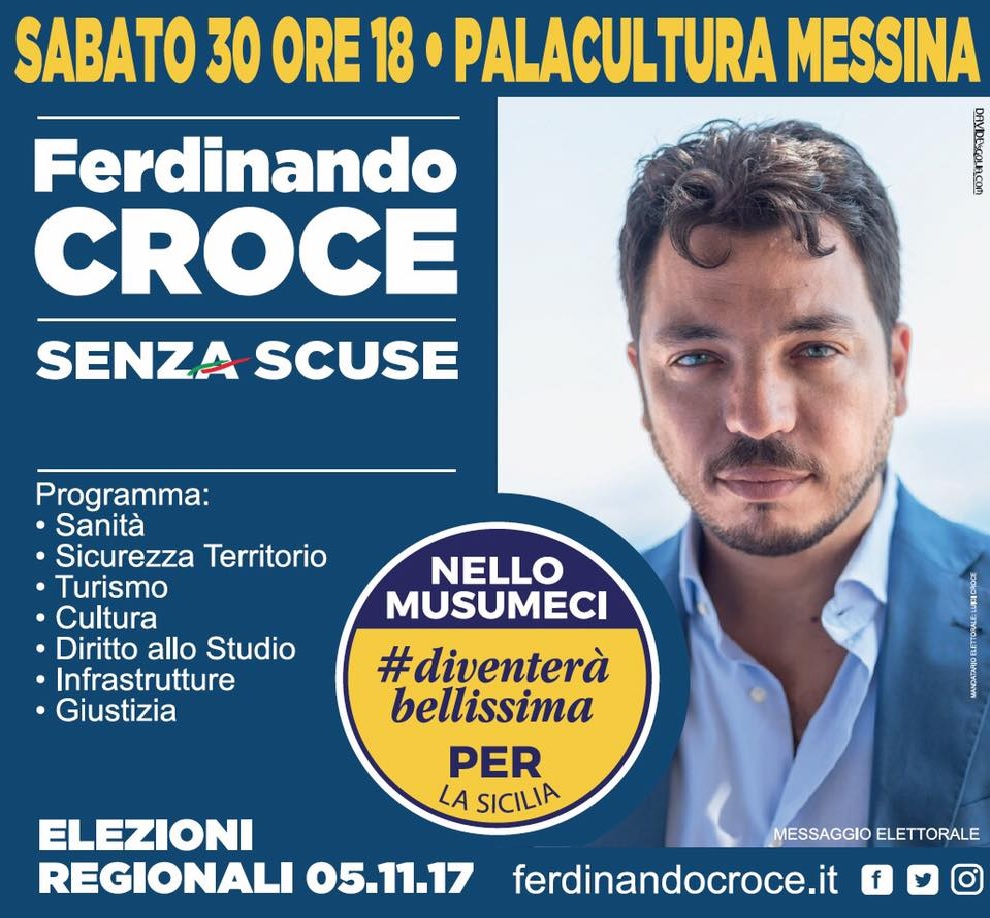 L’avvocato Ferdinando Croce, in relazione all’apertura della propria campagna elettorale in vista della sua candidatura alle Elezioni regionali del 5 novembre, nella Lista “Diventerà Bellissima” a sostegno della candidatura alla presidenza della Regione di Nello Musumeci, scrive: “vi aspettiamo questa sera a partire dalle ore 18 presso il PalaCultura di Messina”.