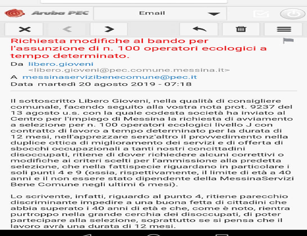“Lo scrivente, infatti, riguardo al punto 4, ritiene parecchio discriminante impedire a una buona fetta di cittadini che abbia superato i 40 anni di età e che, come è noto, rientra purtroppo nella grande cerchia dei disoccupati, di poter partecipare alla selezione, soprattutto se si pensa che il lavoro avrà una durata di 12 mesi. Così come, in merito invece al punto 9, si ritiene ingiusto, nei confronti per esempio degli attuali partecipanti alle borse lavoro che codesta società ha recentemente attivato per 72 unità, impedire loro di poter essere selezionati al pari di tanti altri, specie se si pensa che quella delle borse lavoro rappresenta una piccola opportunità lavorativa che frutta poco più di 400 euro mensili”.