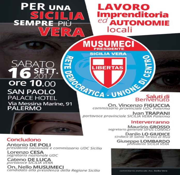 Per una Sicilia sempre più Vera: “Lavoro, imprenditoria ed autonomie locali”, questo il tema dell’incontro di apertura della campagna elettorale in vista della competizione regionale del prossimo 5 novembre (volta al rinnovo della Presidenza della Regione Siciliana e dei 90 deputati di Sala d’Ercole a Palermo) promossa dall’UDC – RETE DEMOCRATICA.
