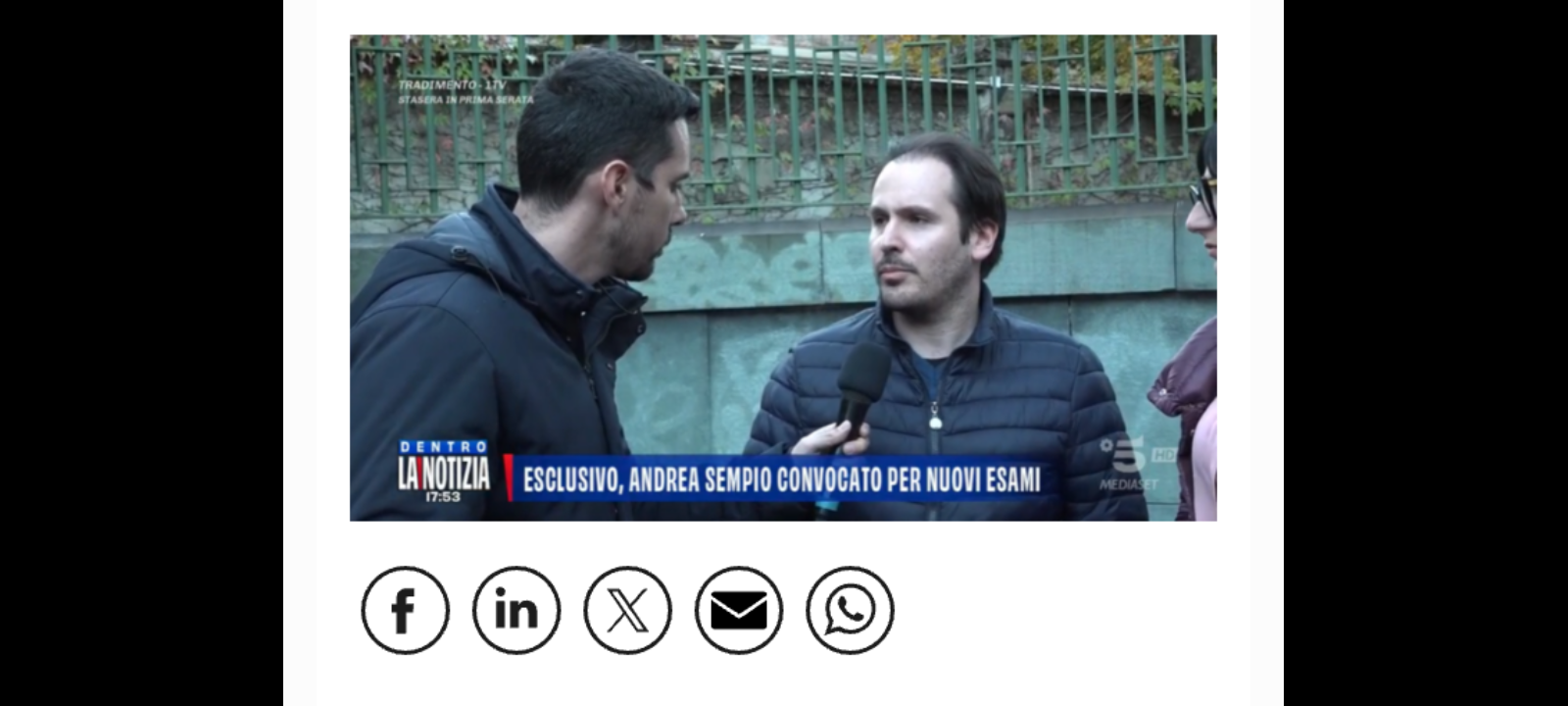 A ‘Dentro la notizia’, su Canale 5, Gianluigi Nuzzi, in diretta, ha reso noto che Andrea Sempio è stato convocato all’Istituto di medicina legale in via Mangiagalli (Milano) dalla antropologa forense Cristina Cattaneo, su ordine della Procura di Pavia, per fare delle misurazioni antropometriche.