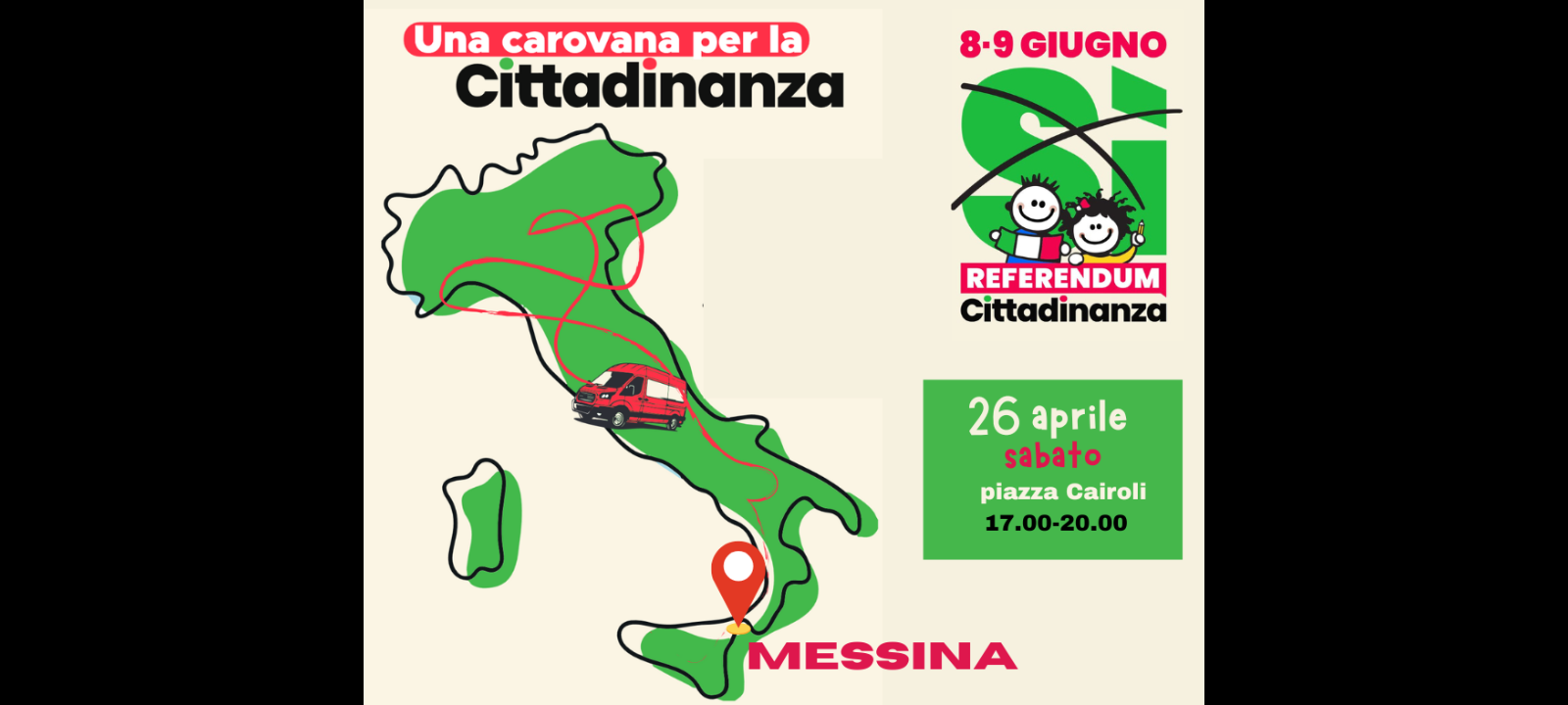 ‘La Carovana farà sosta a Messina, in piazza Cairoli, lato monte, il 26 aprile dalle ore 17:00 alle 20:00 per poi ripartire per un’altra città siciliana… in piazza Cairoli un presidio con un banchetto informativo tenuto dai rappresentati del comitato per sostenere la campagna referendaria ed invitare le cittadine ed i cittadini al voto… sarà un atto di giustizia… votare per portare a 5 anni anziché a 10, gli anni necessari di residenza continuativa per richiedere la cittadinanza italiana’.