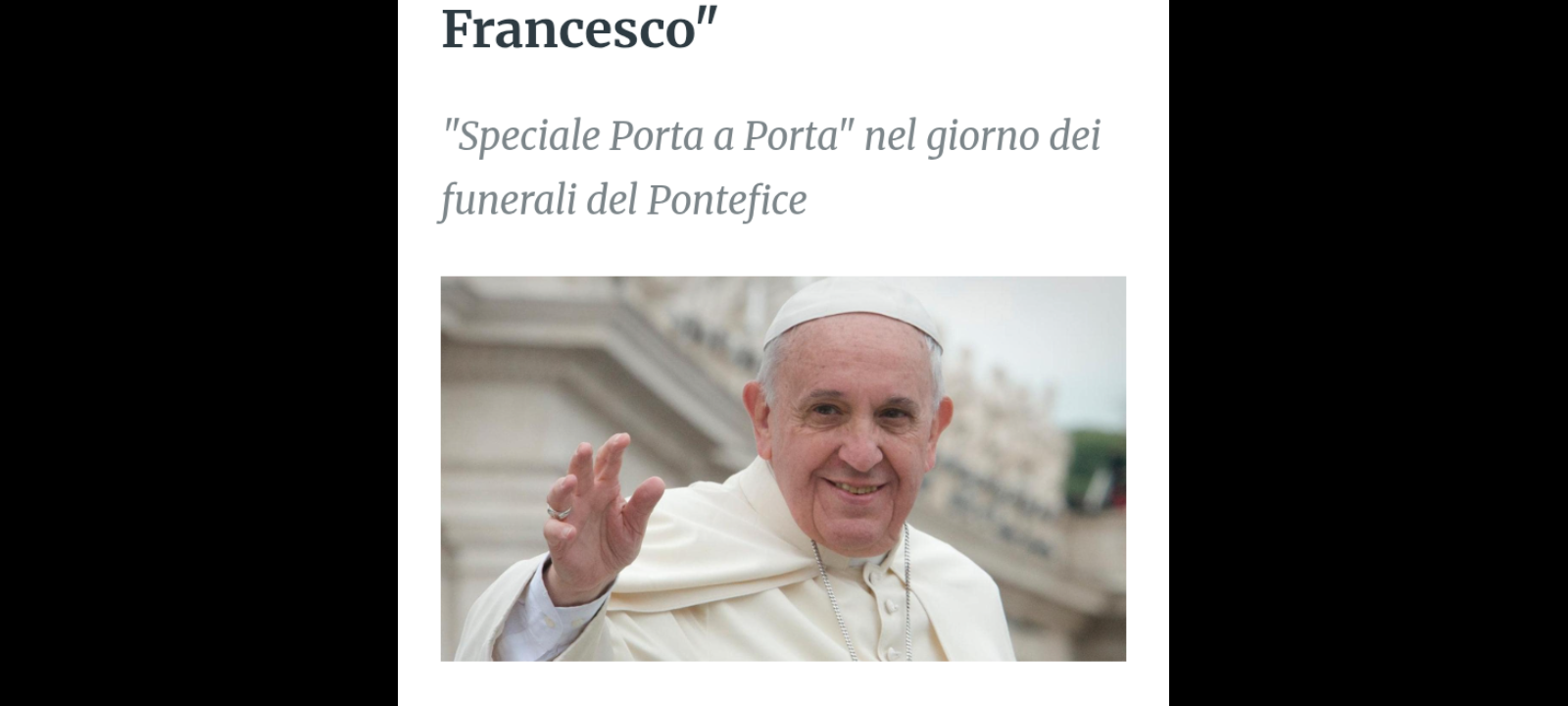 ‘A Papa Francesco, nella giornata dei suoi funerali, è dedicato lo Speciale di “Porta a Porta” dal titolo “Il Nuovo Inizio di Papa Francesco” che è iniziato in onda sabato 26 aprile alle 20.30 su Rai1’.