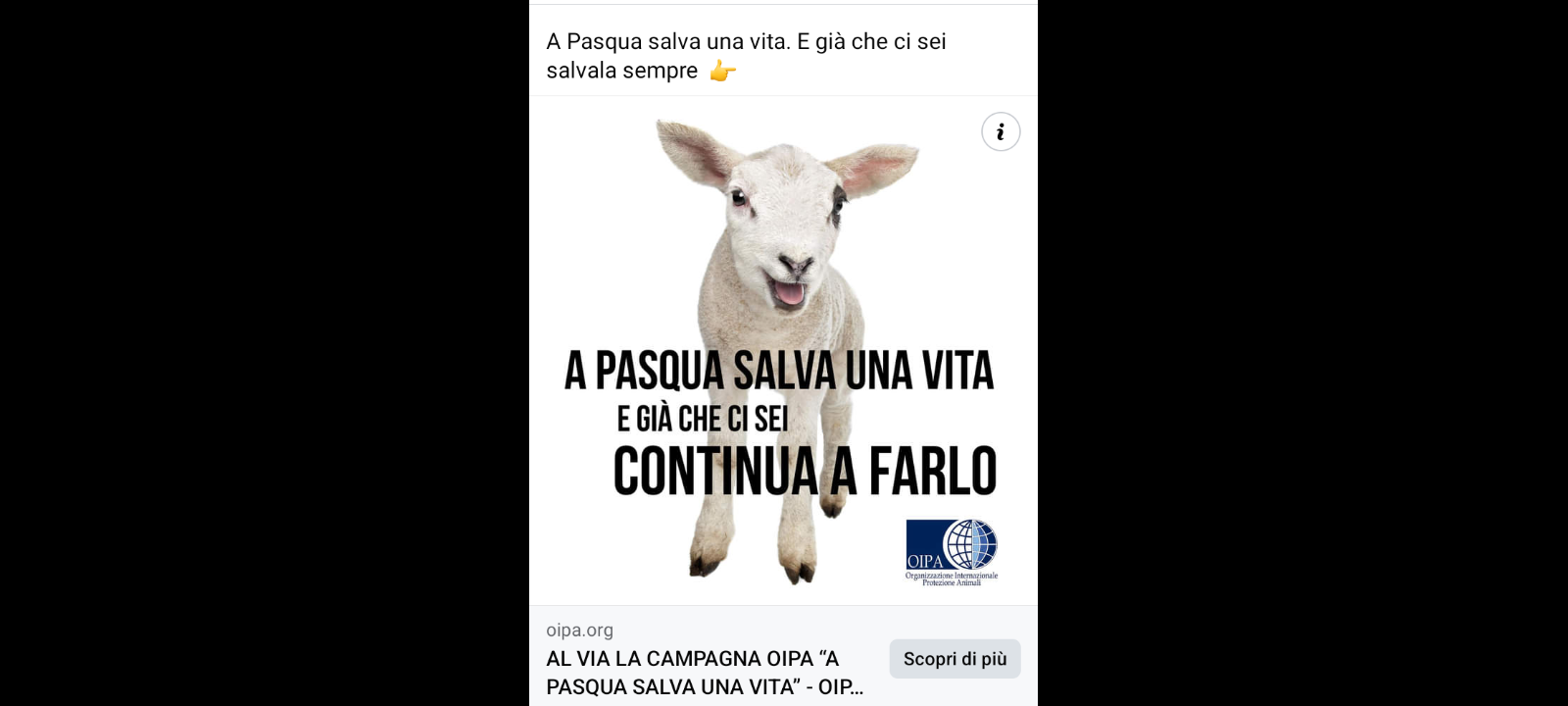 - “per fortuna negli ultimi anni sempre più persone scelgono di non acquistare carne d’agnello. Con lo slogan della campagna di Pasqua 2024 l’OIPA invita a riflettere anche su quel che accade a tutti gli altri animali d’allevamento che soffrono allo stesso modo. Le alternative alla carne sono molte, e chi di sceglie di non mangiare animali non è complice di un sistema che considera esseri senzienti come meri oggetti di consumo usati e abusati”;