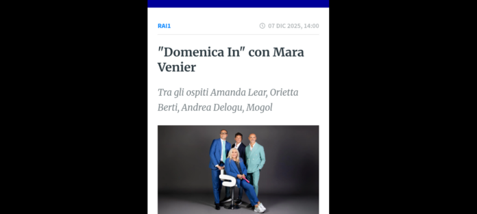 ‘Amanda Lear, cantante, attrice, showgirl e icona internazionale, si confiderà in un’intervista esclusiva con Mara Venier ripercorrendo i momenti più significativi della sua vita artistica e personale; mentre Andrea Delogu, in compagnia del maestro di ballo Nikita Perotti, racconterà il suo percorso a “Ballando con le Stelle”; si parlerà ancora di musica con Orietta Berti, che proporrà il suo ultimo singolo “Chi ama, chiama”; mentre il paroliere e produttore musicale Mogol presenterà il libro autobiografico “Senza paura, la mia vita”, e il cantautore Gianmarco Carroccia sarà protagonista di un medley dedicato a Lucio Battisti; e ancora, l’ex campione di motociclismo Max Biaggi condividerà l’emozione di essere stato uno dei tedofori a Roma per la Fiamma Olimpica dei Giochi Invernali Milano-Cortina 2026’. Questi… sono alcuni dei temi ed i partecipanti di una puntata tra musica, racconti e attualità di “Domenica In” – condotta da Mara Venier, affiancata da Tommaso Cerno, Teo Mammucari ed Enzo Miccio – che è iniziata in onda Domenica 7 dicembre alle 14.00 su Rai1 in diretta dagli Studi Fabrizio Frizzi di Roma.