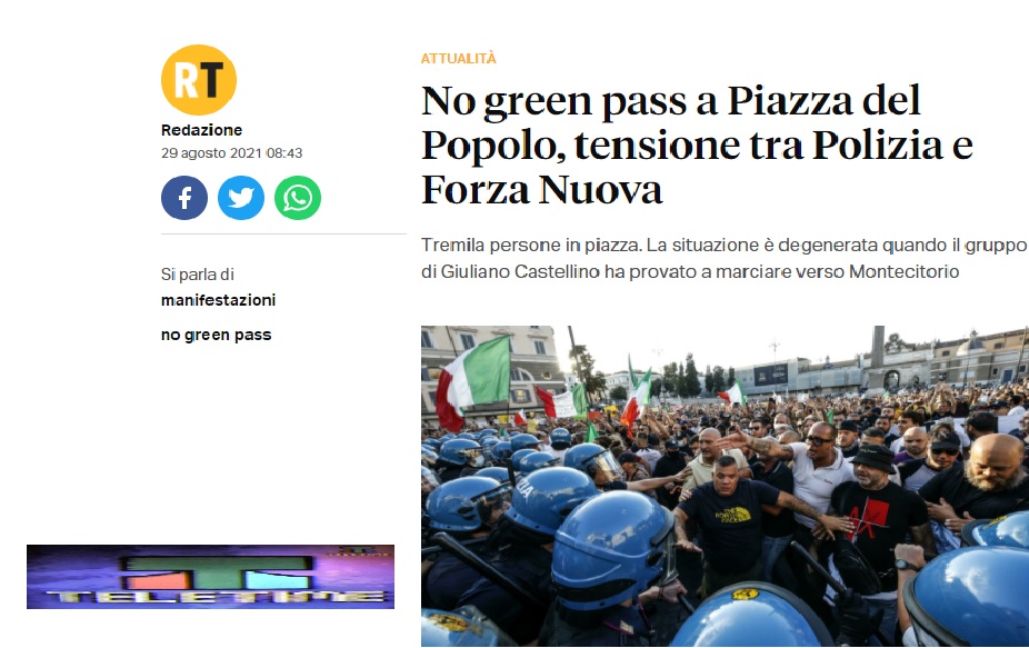 Anche a Roma il popolo dei No Green pass è sceso in strada ieri, sabato 28 agosto 2021. Tremila persone hanno affollato piazza del Popolo, con i soliti cartelli contro la dittatura sanitaria, contro Draghi, Speranza e il Governo tutto. Novità lo striscione per chiedere la verità per la morte del dottor De Donno. Immancabili, ovviamente, i cartelli e gli insulti contro i giornalisti e la dittatura mediatica.