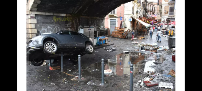 Poco dietro il suo proprietario, con il casco, che viene trasportato dall’acqua ed è soccorso da alcuni passanti. La scena è stata ripresa da più persone e i video sono diventati virali sui social. Anche un’auto è stata trasportata dall’acqua ed è ‘salita’ sui paletti in metallo che costeggiano la ‘pescheria’ vicina a piazza Duomo.