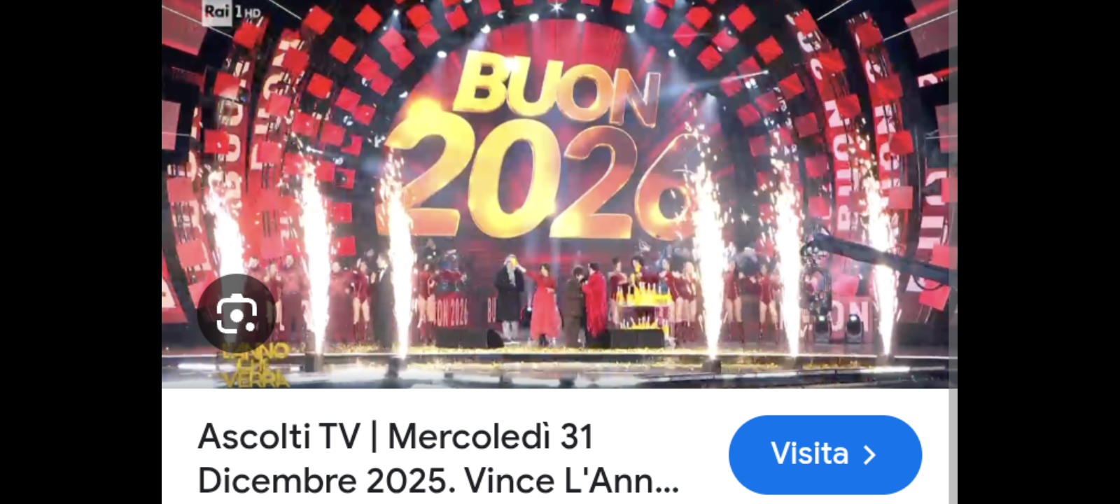 Capodanno col botto su Rai 1: “L’anno che verrà”, in diretta dal lungomare di Catanzaro in compagnia di Marco Liorni, ha stravinto la fascia oraria con una media del 35,5% di share e oltre 5 milioni 200 mila spettatori (5 milioni 204 mila)… in particolare, dal 29,8% di share e 4 milioni 690 mila della prima parte si è passati al 37,3% di share e 5 milioni 357 mila spettatori nella seconda e al 35% di share e 3 milioni 97 mila spettatori nella terza parte… a mezzanotte oltre la metà della platea televisiva, 7 milioni 897 mila telespettatori pari al 51,6% di share, ha brindato sulla rete ammiraglia con Liorni. Molto bene in prima serata su Rai 2 il classico Disney “Lilli e il vagabondo” visto da 913 mila telespettatori e il 5,9% di share.