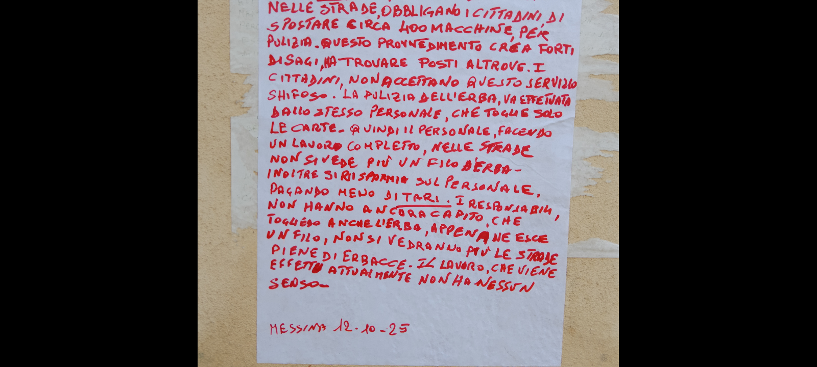 “Avviso: Vorremmo sapere a quale persona dentro Messinaservizi (che da circa 3 anni, per fare la Pulizia nelle strade, obbligano i cittadini a spostare circa 400 macchine) è venuto in mente questo”. Lo hanno scritto lo scorso 12 ottobre 2025, in un grande foglio appeso su un muro in via Napoli ad angolo con viale Europa a Messina, alcuni residenti esasperati da questo andazzo ormai triennale… evidenziando nel testo offese che non pubblichiamo per non incorrere nel reato di Diffamazione, fungendo semplicemente da pungolo nei riguardi dei membri della Società Partecipata dal Municipio messinese.
