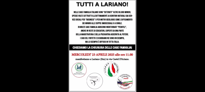 “Ci siamo: Ritorniamo in piazza per chiedere la chiusura delle case famiglia, luoghi della distruzione psico-fisica dei minori… partecipate, raccontate pubblicamente la vostra storia, divulgatela… fate i nomi delle case famiglia in cui sono internati i vostri figli”! Lo ha riferito in una nota odierna pubblicata sul suo omonimo Profilo Facebook, l’avvocato romano Gian Luca Gismondi, presidente dell’Associazione ‘I figli del Mediterraneo’ (www.figlidelmediterraneo.org – canale YouTube https://www.youtube.com/@AVV.GIANLUCAGISMONDI).