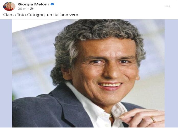 “Ciao a Toto Cutugno, un Italiano vero”. Così oggi 22 agosto 2023, dopo avere appreso la notizia della morte di Toto Cutugno diffusasi dopo le 16.00, si è espressa sulla sua omonima Pagina Facebook la presidente del Consiglio dei ministri dell’Italia Giorgia Meloni
