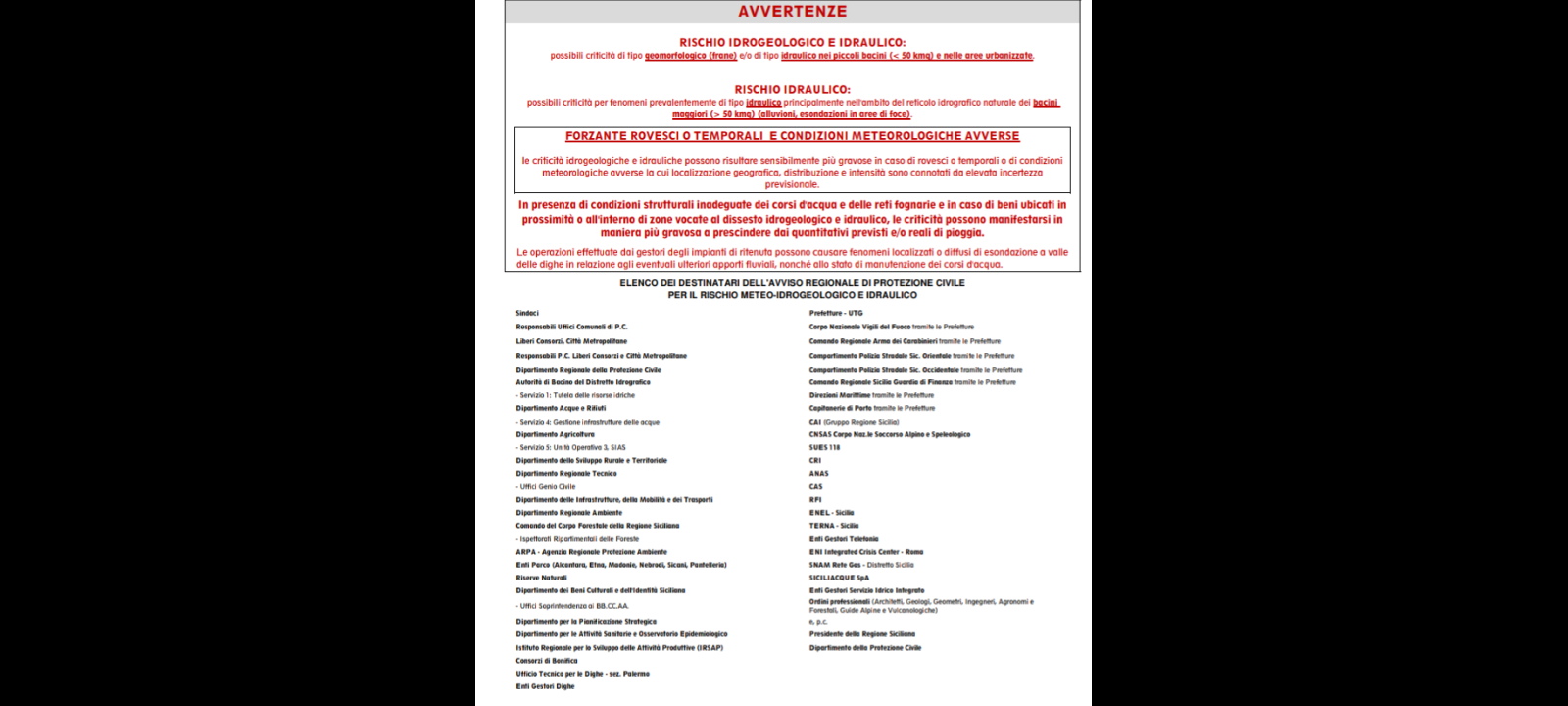 Sindaci, Responsabili Uffici Comunali di P.C., Liberi Consorzi, Città Metropolitane, Responsabili P.C., Liberi Consorzi e Città Metropolitane, Dipartimento Regionale della Protezione Civile, Autorità di Bacino del Distretto Idrografico -Servizio 1: Tutela delle risorse idriche, Dipartimento Acque e Rifiuti, Servizio 4: Gestione infrastrutture delle acque, Dipartimento Agricoltura, -Servizio 5: Unità Operative 3 SIAS, Dipartimento delle Sviluppo Rurale e Territoriale, – Uffici Genio Civile, Prefetture-UTG, Corpo Nazionale Vigili del Fuoco tramite le Prefetture, Comando Regionale Arma dei Carabinieri tramite le Prefetture, Compartimento Polizia Stradale Sicilia Orientale tramite le Prefetture, Compartimento Polizia Stradale Sicilia Occidentale tramite le Prefetture, Comando Regionale Sicilia Guardia di Finanza tramite le Prefetture, Direzioni Maritime tramite le Prefetture, Capitanerie di Porto tramite le Prefetture, CAI (Gruppo Regione Sicilia), CNSAS Corpe Nazionale Soccorso Alpine e Speleologiche, SUES 118, CRI Dipartimento Regionale Tecnico, ANAS, CAS, Dipartimento delle Infrastrutture, della Mobilità e dei Trasporti, RFI, Dipartimento Regionale Ambiente, Comando del Corpo Forestale della Regione Siciliana -Ispettorati Ripartimentali delle Foreste, ARPA Agenzia Regionale Protezione Ambiente, Enti Parco (Alcantara, Etna, Madonie, Nebrodi, Sicani, Pantelleria), Riserve Naturali, Dipartimento dei Beni Culturali e dell’identità Siciliana, Uffici Soprintendenza al BB.CC.AA., Dipartimento per la Pianificazione Strategica, Dipartimento per le Attività Sanitarie e Osservatorio Epidemiologico, Istituto Regionale per lo sviluppo delle Attività Produttive (IRSAP), Consorzi di Bonifica, Ufficio Tecnico per le Dighe-sez. Palermo, Enti Gestori Dighe, ENEL-Sicilia, TERNA-Sicilia, Enti Gestori Telefonia, ENI Integrated Crisis Center-Roma, SNAM Rete Gas-Distretto Sicilia, SICILIACQUE SPA, Enti Gestori Servizio idrico Integrato, Ordini professionali (Architetti Geologi, Geometri, Ingegneri, Agronomi e Forestali Guide Alpine e Vulcanologiche), Presidente della Regione Siciliana – Dipartimento della Protezione Civile.