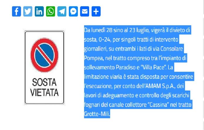 Da lunedì 28 sino al 23 luglio, vigerà il divieto di sosta, 0-24, per singoli tratti di intervento giornalieri, su entrambi i lati di via Consolare Pompea, nel tratto compreso tra l’impianto di sollevamento Paradiso e “Villa Pace”.