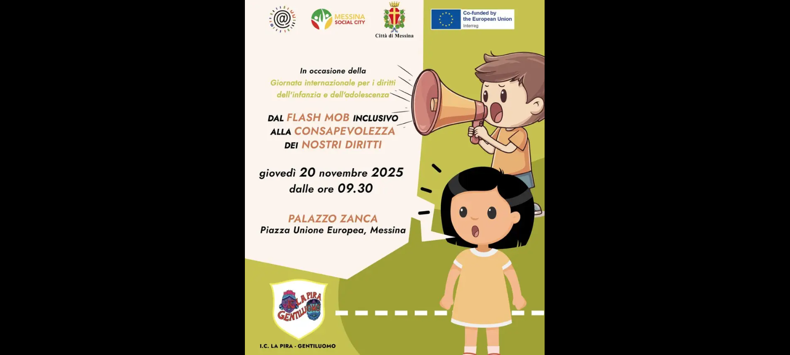 Domani, giovedì 20 novembre 2025, in occasione della Giornata Internazionale dei Diritti dell’Infanzia e dell’Adolescenza, il Comune di Messina, tramite l’Assessorato alla Pubblica Istruzione e Pari Opportunità, ha organizzato un’importante mattinata di celebrazione e sensibilizzazione in sinergia con la Messina Social City e l’Istituto Comprensivo La Pira–Gentiluomo, frutto di un percorso intrapreso già dall’Inclusivity village, dello scorso settembre.