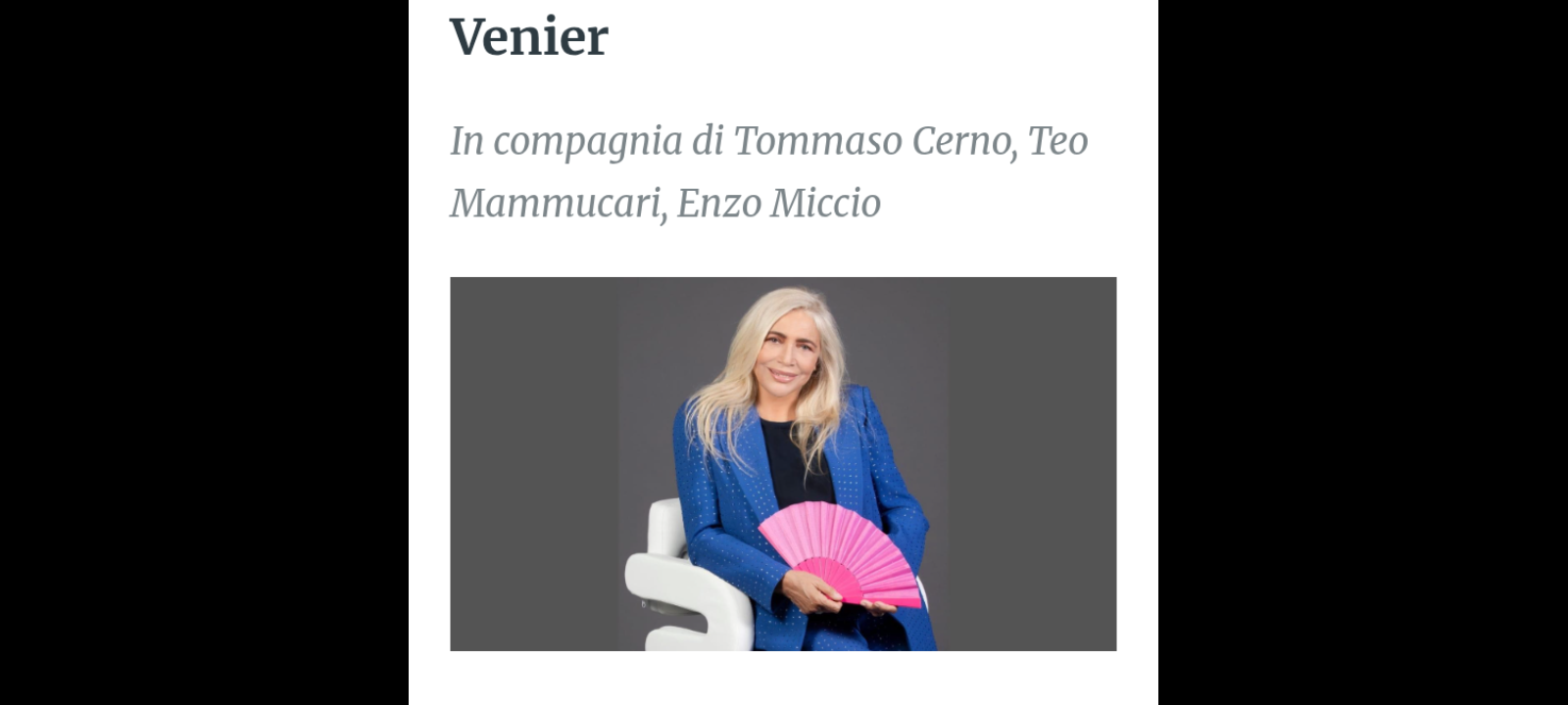 • a tu per tu con Mara Venier, Loretta Goggi si racconterà tra carriera e vita privata, mentre Pier Francesco Pingitore ripercorrerà il successo delle sue ‘Ragazze’ che hanno segnato un’epoca televisiva;