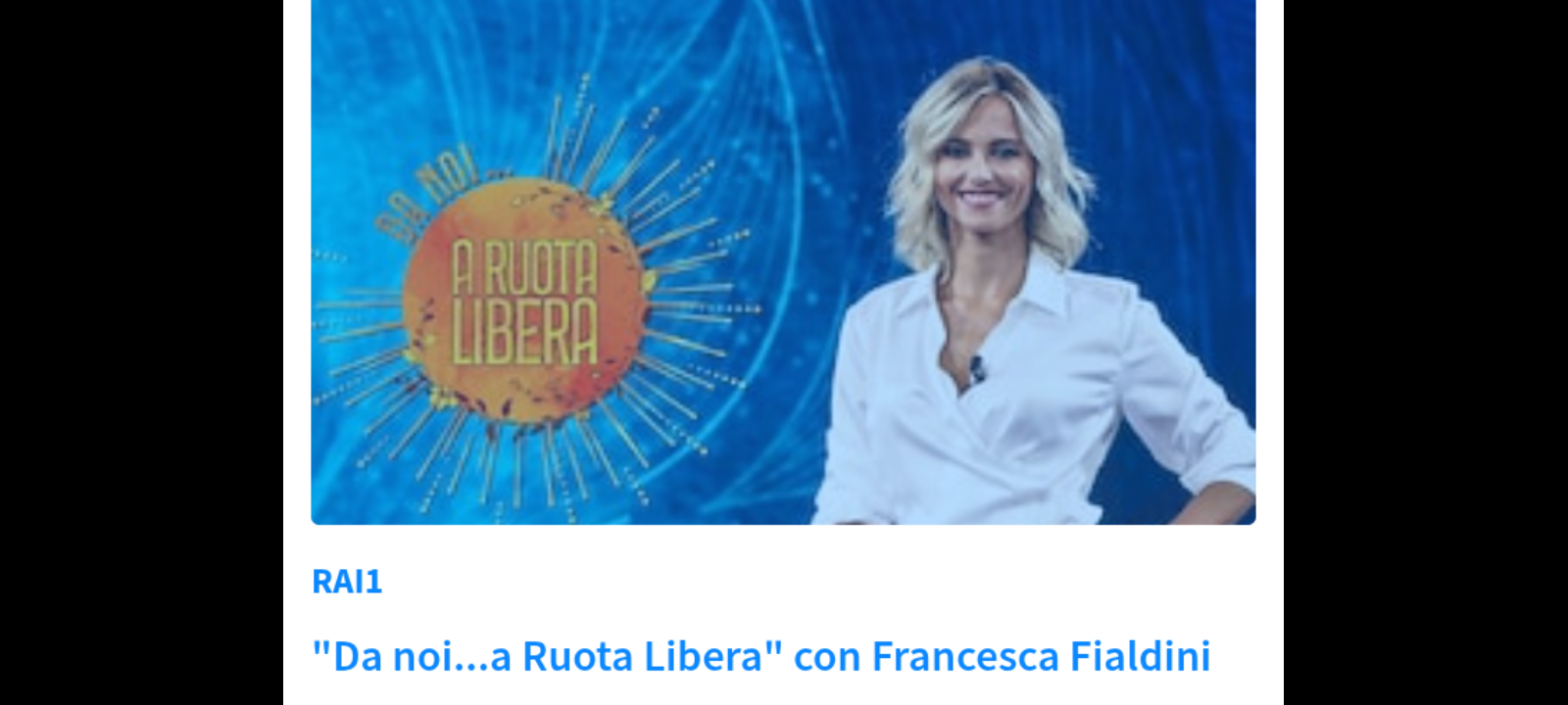 È previsto un nuovo appuntamento con “Da Noi… a Ruota Libera”, il programma condotto da Francesca Fialdini realizzato dai membri della Direzione Intrattenimento Day Time in collaborazione con gli appartenenti ad Endemol Shine Italy, in onda domenica 14 dicembre alle 17.20 su Rai1.