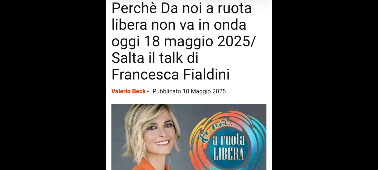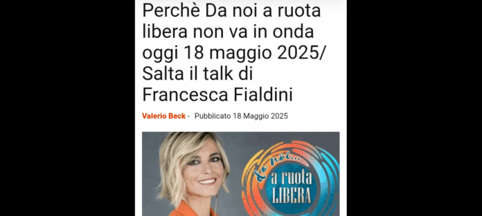 È saltato l’appuntamento con le piacevoli, intense e ricche interviste di Francesca Fialdini; come di consueto – oggi 18 maggio 2025 – appena dopo Domenica In sarebbe dovuta andare in onda una nuova puntata de ‘Da noi a ruota libera’. Gli appassionati hanno dovuto però fare a meno del salotto del pieno pomeriggio domenicale a causa di un necessario cambio di programmazione per un altro appuntamento degno di nota… la finale degli Internazionali D’Italia 2025 a Roma con Jannik Sinner contro Carlos Alcaraz.