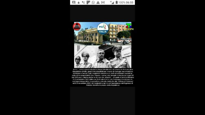 “Ecco…, come questa Giustizia (Abusi dei Modelli 44 e 45 presso le Procure della Repubblica d’Italia; giudici incompatibili per vincolo di coniugio che emettono Decreti e Sentenze nulli; magistrati minorili e civili dei Tribunali e delle Corti d’Appello ordinari e dei minorenni e assistenti sociali che tolgono illegalmente i figli ai genitori violando la Legge 149 del 2001)… puo’ colpire anche te se non stai attento”. Cosi’ scrive oggi 20 novembre 2022, in una nota, Filippo Pansera responsabile provinciale del Partito Nazionale ‘Piu’ Italia’ con sede a Frosinone e rappresentato dal presidente Fabrizio Pignalberi, per annunciare la odierna manifestazione che si terra’ a Messina dalle 09.45 alle 10.45 in via Tommaso Cannizzaro innanzi il locale Tribunale in corrispondenza delle tre ‘panchine contro la violenza’.