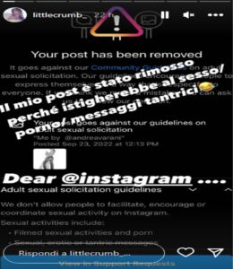 Instagram ha però chiarito: “Sappiamo che talvolta le persone desiderano condividere immagini di nudo artistiche o di natura creativa, ma per diversi motivi non è consentita la pubblicazione di contenuti di nudo su Instagram. Sono inclusi le foto, i video e altri contenuti creati con strumenti digitali che mostrano rapporti sessuali, genitali e primi piani di fondoschiena nudi. Sono comprese inoltre alcune foto con capezzoli femminili in vista, tranne che nel contesto di allattamento al seno, parto e momenti successivi al parto, situazioni correlate alla salute (ad es. in seguito a una mastectomia, sensibilizzazione sul cancro al seno o chirurgia di conferma del genere) o atto di protesta”.