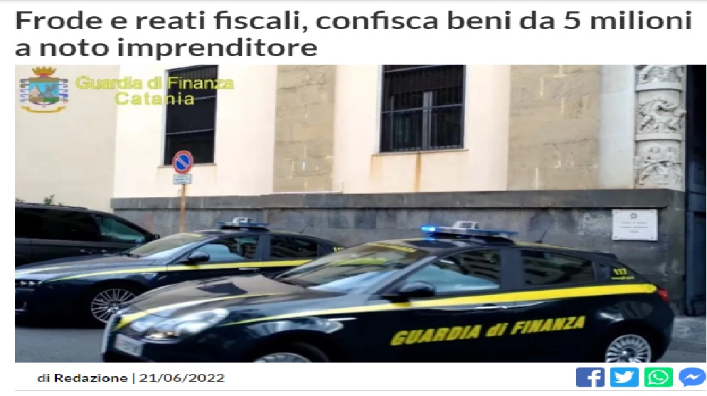 Beni per complessivi 5 milioni di euro sono stati confiscati dalla Guardia di finanza di Catania all’imprenditore Alessio Primo Tirendi, originario di Milano e residente nella provincia etnea, più volte indagato per violazioni tributarie e commissione di frodi nel settore delle accise. Al centro del provvedimento, richiesto dalla Procura, indagini di unità specializzate del Gico del Nucleo Pef delle Fiamme gialle.