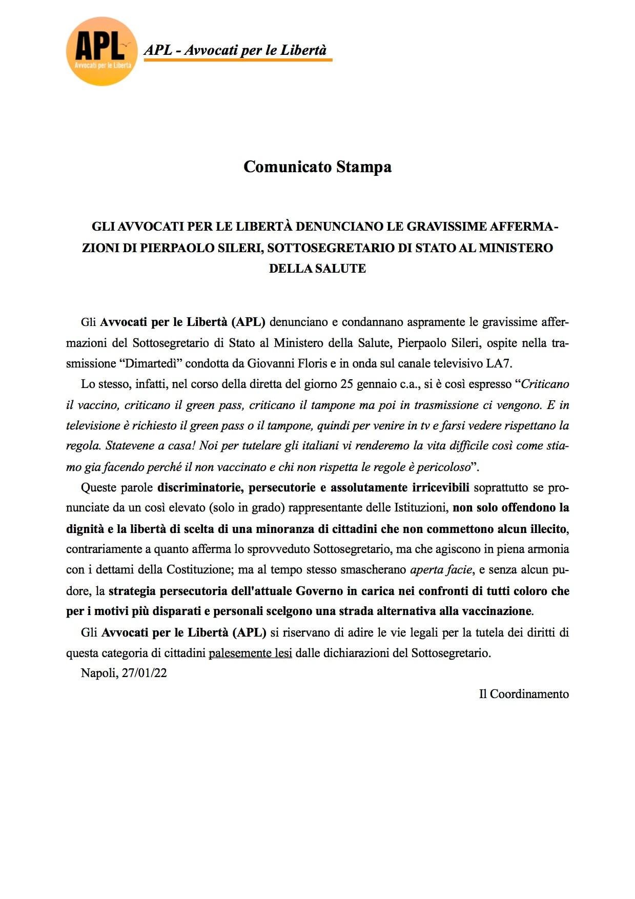 Gli Avvocati per le Libertà (APL) denunciano e condannano aspramente le gravissime affermazioni del Sottosegretario di Stato al Ministero della Salute, Pierpaolo Sileri, ospite nella trasmissione “Dimartedì” condotta da Giovanni Floris e in onda sul canale televisivo LA7, in quanto trattasi di espressioni discriminatorie, persecutorie e assolutamente irricevibili.