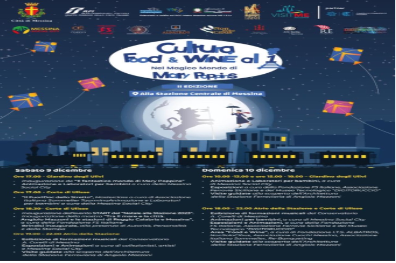 L’allegria e la magia della “supertata” Mary Poppins si unisce ai laboratori e animazione per bambini; l’esecuzione di brani musicali a cura del Conservatorio Corelli; la mostra “Tra il mare e la città. Angiolo Mazzoni e le stazioni di Reggio Calabria e Messina”, a cura della Fondazione FS Italiane esposizioni di collezioni dell’Associazione Ferrovie Siciliane, del Dopolavoro ferroviario e dell’Associazione DIGITORUCCIO; ed ancora l’area Food e Wine a cura dell’Associazione Cuochi, dell’Associazione Italiana Sommelier sez. Taormina, NonsoloCibus e della Fondazione ALBATROS.