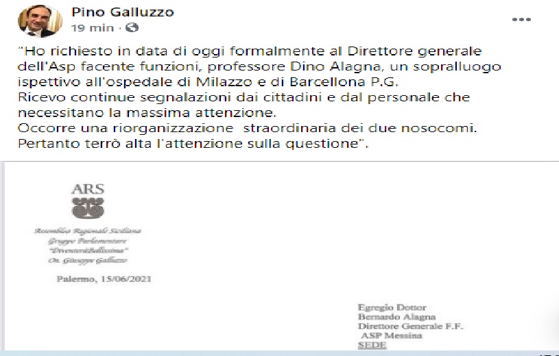 “Ho richiesto in data di oggi formalmente al Direttore generale dell’Asp facente funzioni, professore Dino Alagna, un sopralluogo ispettivo all’ospedale di Milazzo ed a quello di Barcellona”