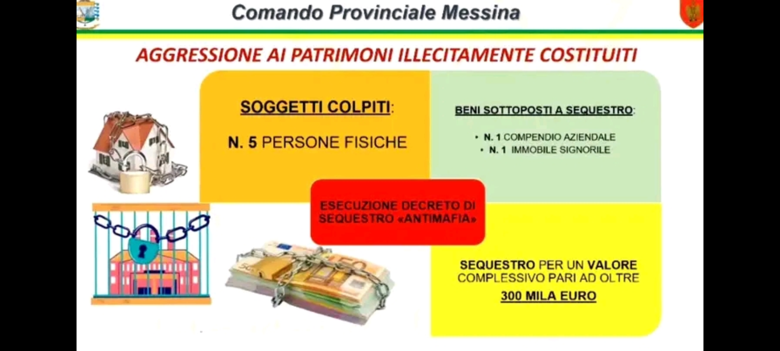 Il valore complessivo dei beni sigillati ammonta ad oltre 300mila euro. Come da prassi, i responsabili della Procura della Repubblica precisano che il provvedimento può essere oggetto di impugnazione e che eventuali gradi di giudizio successivi potrebbero modificarne l’esito.
